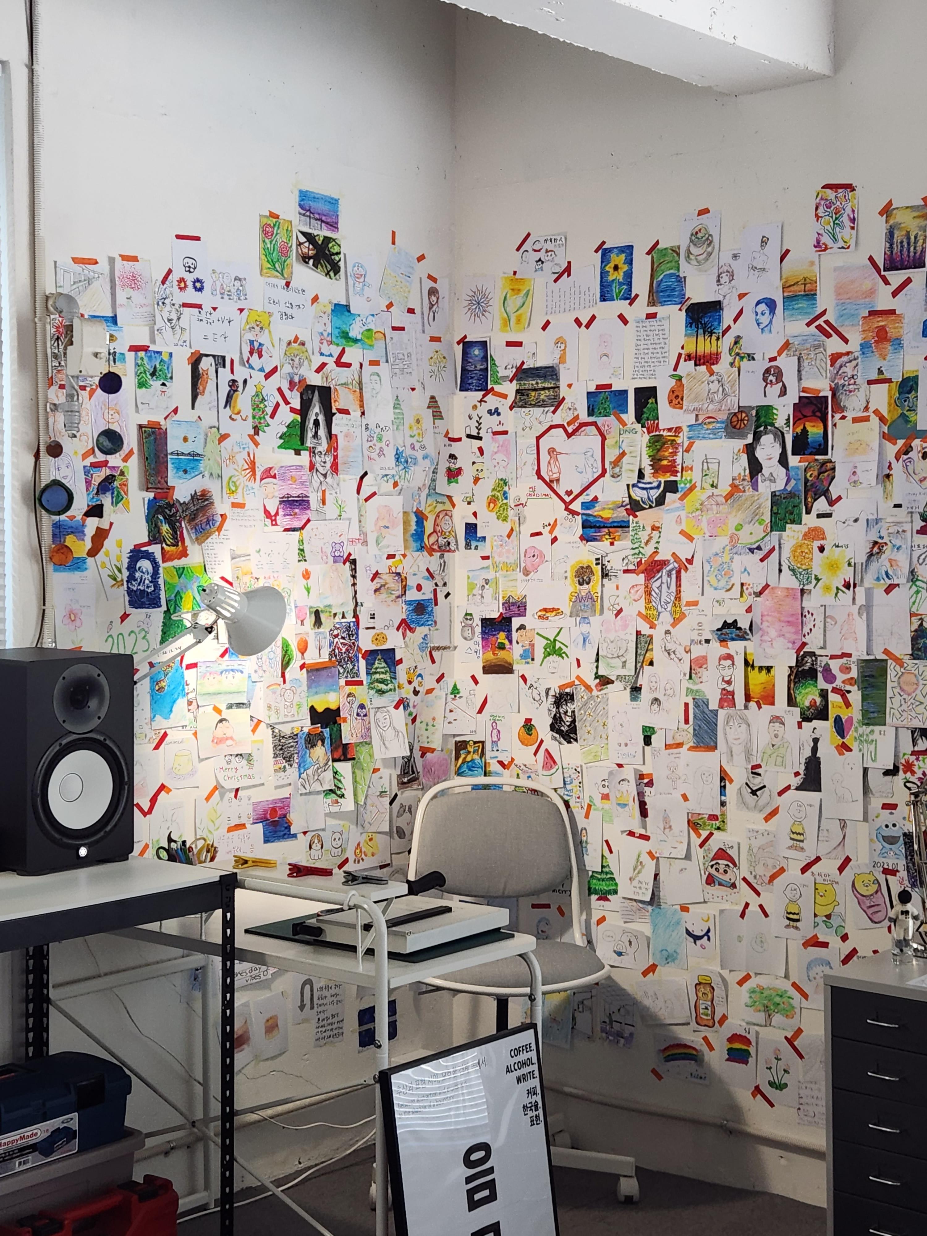 카페가 그리 넓지 않은데 창가쪽에 테이블 6개 중간에 3개 테이블 9개? 제가 갔던 시간은 오후 2~3시쯤이었는데 시즌 초반임에도 불구하고 사람이 많았습니다. 인테리어는 SNS에서 본 방과 똑같았고, 주문 후 사진을 찍었습니다. ‘멍’은 고객들에게 그림을 그릴 수 있는 종이와 크레용, 색연필을 제공하는데 이렇게 그려진 그림들을 모아 붙여넣는 코너 부분이 마음에 들었다. 이 카페에 가고 싶었던 이유이기도 합니다.