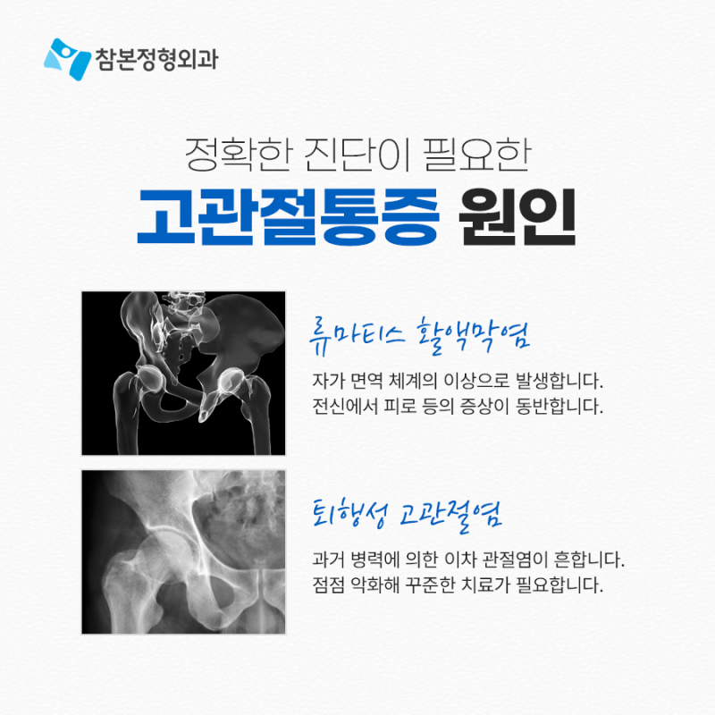 1. 퇴행성 고관절염 노화에 따른 퇴행성 고관절염은 주로 과체중이나 노화로 인해 관절 연골이 닳아 각종 운동 장애와 통증을 동반하는 질환이다. 우리나라에서는 55세 이상 인구의 80% 이상이 퇴행성관절염 증상이 나타나며, 대부분 75.2세에 골관절염 증상이 나타난다. 대퇴골두 무혈성 괴사 대퇴골두 무혈성 괴사는 순환부전으로 인한 대퇴골두의 괴사로 인해 발생하는 질환으로 30~50대에 가장 많이 발생한다. 일반적인 통증은 사타구니, 엉덩이, 허벅지, 무릎에 발생하며 관절 운동 자체가 어려운 경우가 많습니다. 삼. 고관절충돌증후군은 골반뼈와 관절을 이루고 있는 대퇴골두가 돌출되어 움직이면서 골반의 비구와 충돌하는 질환입니다. 움직일 때마다 통증이 발생합니다.