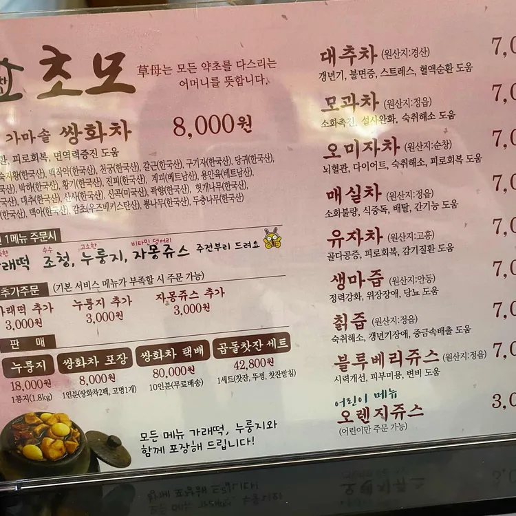 쌍화탕을 파는 가게가 많은데 어디를 가도 똑같으니 너무 걱정하지 마세요. 예전에 “다쏘니”라는 곳에서 생강차를 마시곤 했는데 직접 생강을 갈아서 장아찌로 판매하니 생강향과 맛이 난다.난 다 기억해